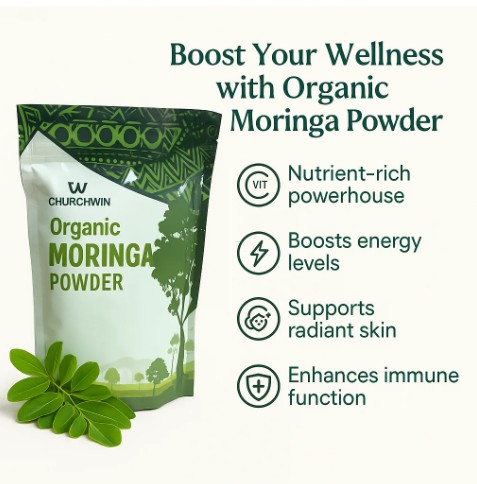 Churchwin Moringa Powder is a premium-quality green superfood made from carefully harvested moringa leaves. Moringa is widely known for its high nutritional value, providing essential vitamins, minerals, antioxidants, and plant-based nutrients that support daily health and vitality.